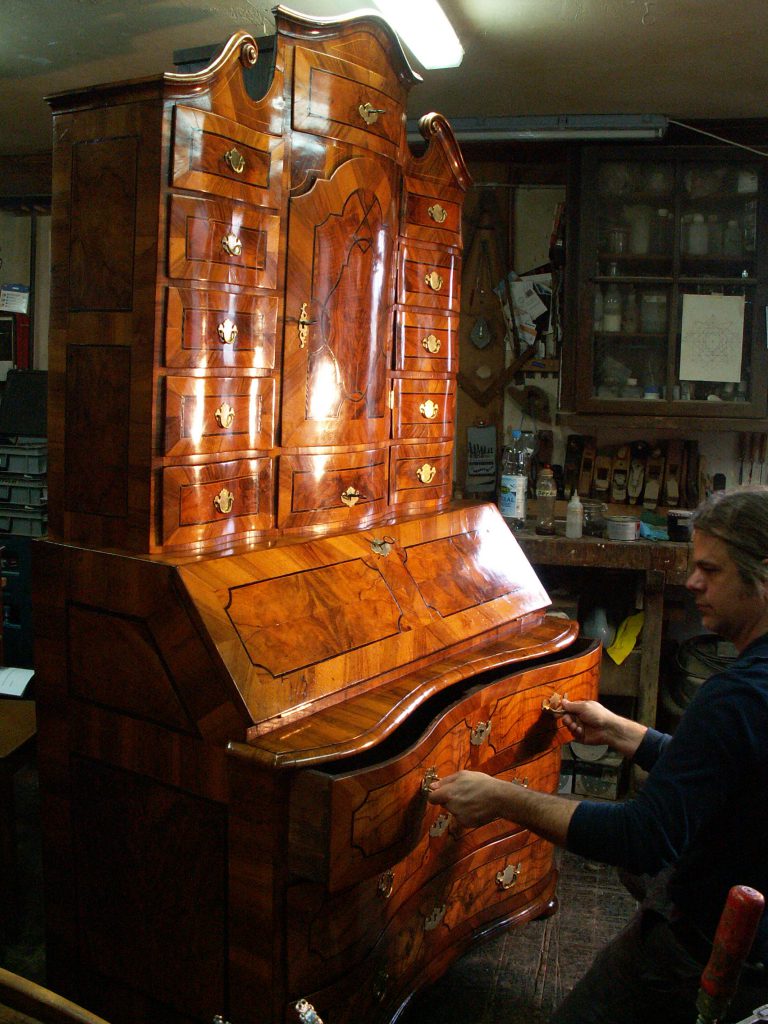Denn die Patina ist es, die im wesentlichen den Wert und Charme einer Antiquität ausmacht. Sie kann uns viel über die Geschichte eines Möbels erzählen. Restaurieren heisst für mich die Patina zu schonen, und den Generationen die nach uns kommen zu erhalten.