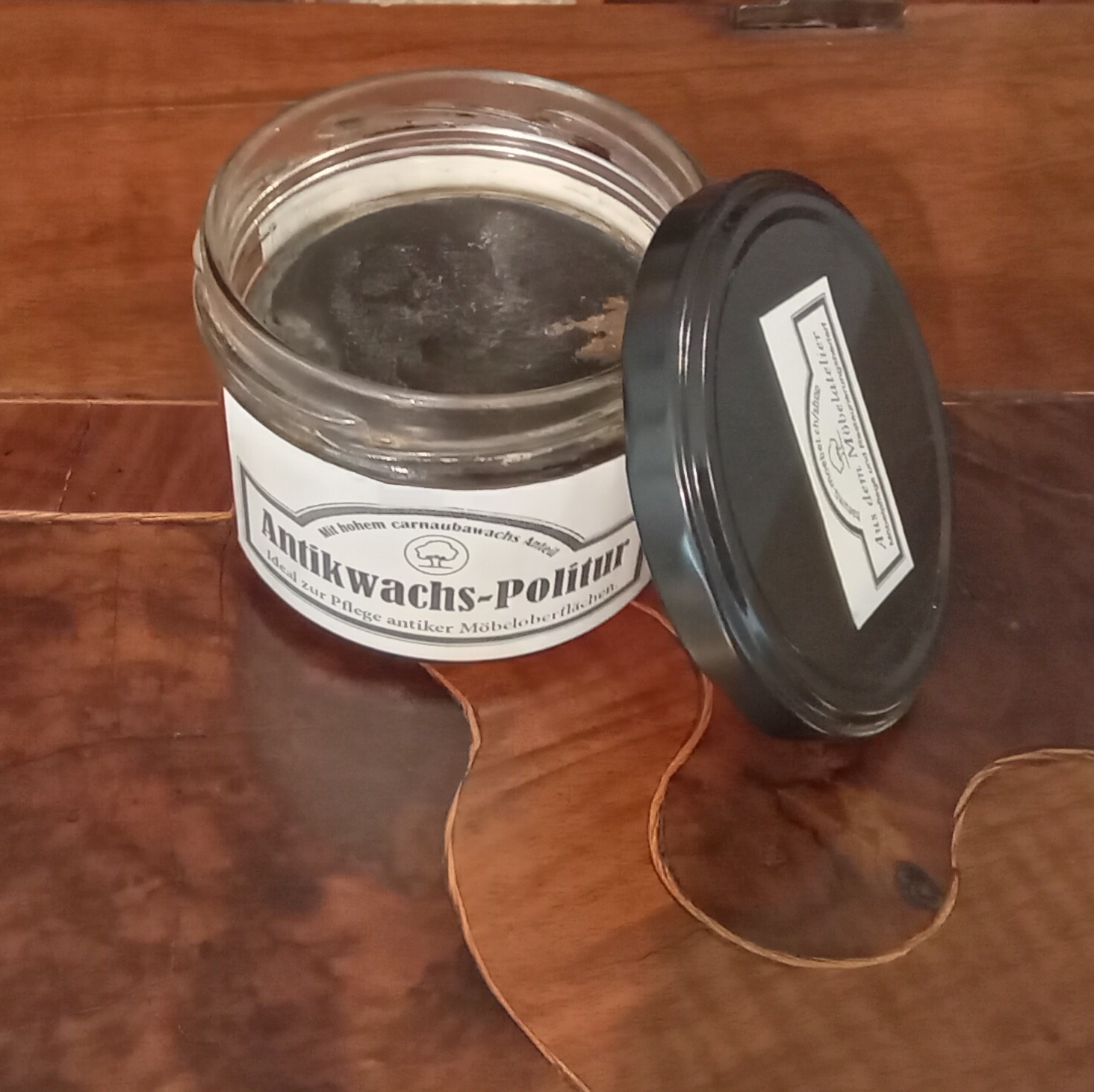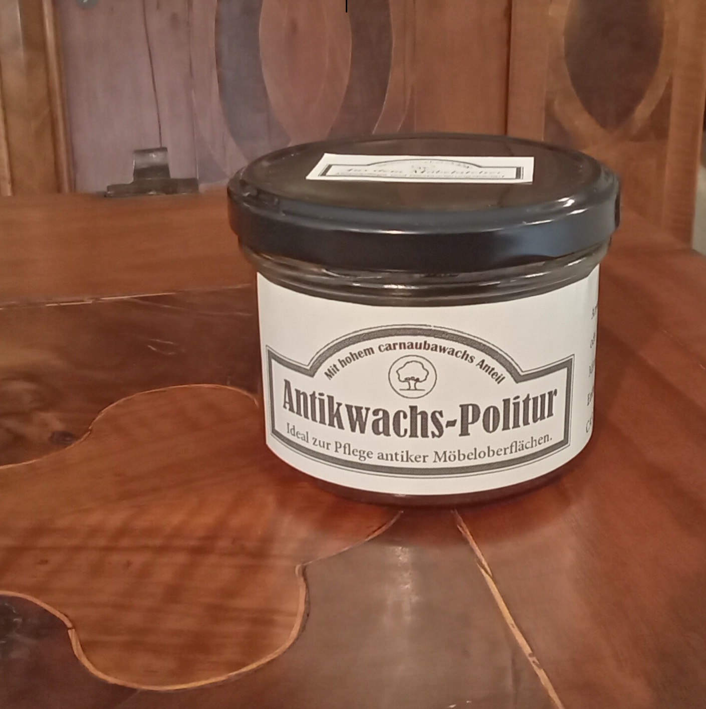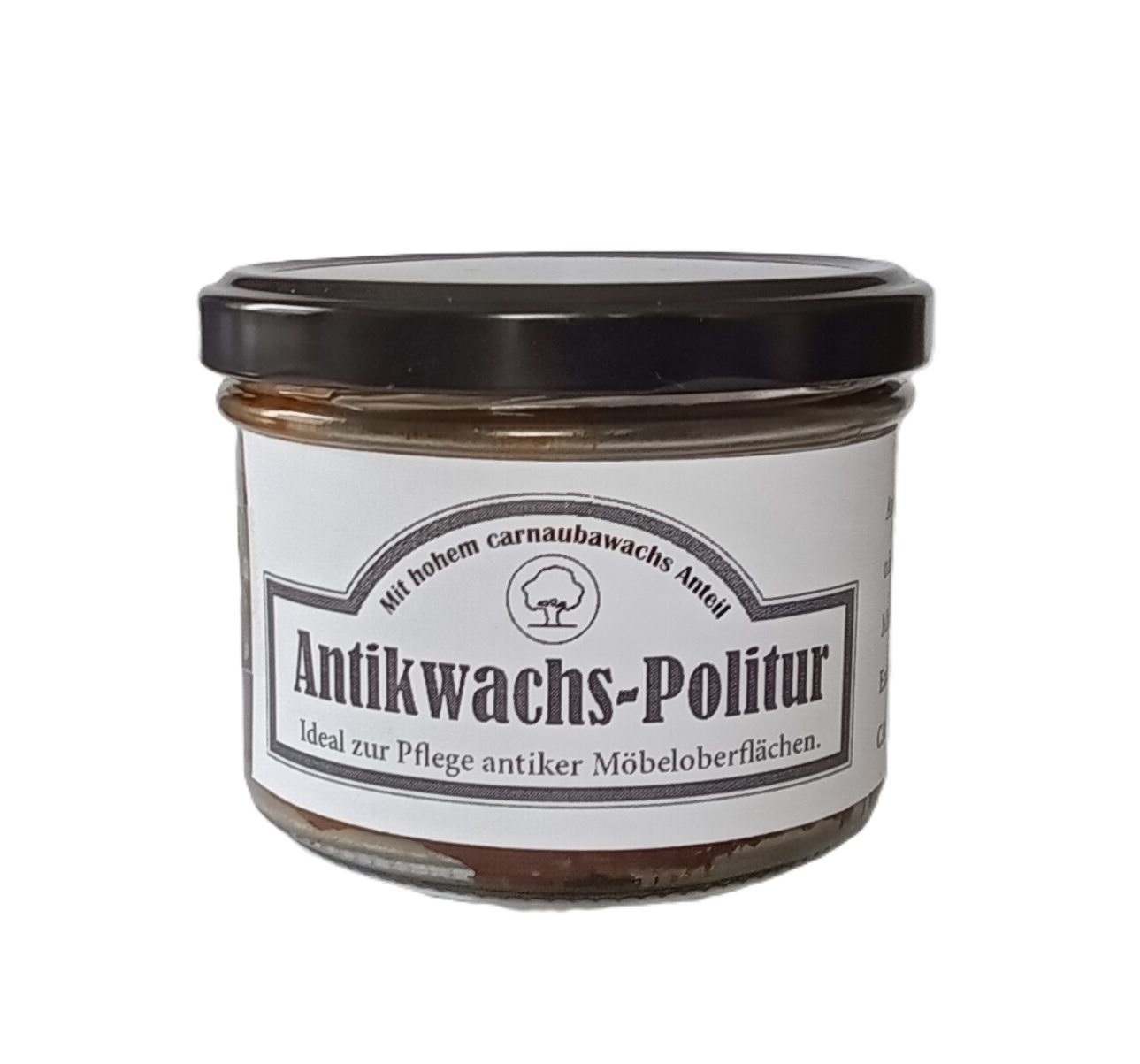 Die Antikwachs Politur aus eigener Produktion, ist ein Möbelwachs mit einem sehr hohem Carnaubawachs Anteil von über 70%. Es eignet sich daher besonders gut um alte, ausgetrocknete Oberflächen alter Möbel zu pflegen. Durch die Beimischung von Myrica- und Bienenwachs, gelöst in verschiedenen Terpentinen, bleibt dieses besonders geschmeidig und lässt sich gut verarbeiten. Dank der hohen Härte des Carnaubwachs wird das Holz effektiv vor äußeren Einflüssen wie Feuchtigkeit, Staub und Kratzern geschützt.