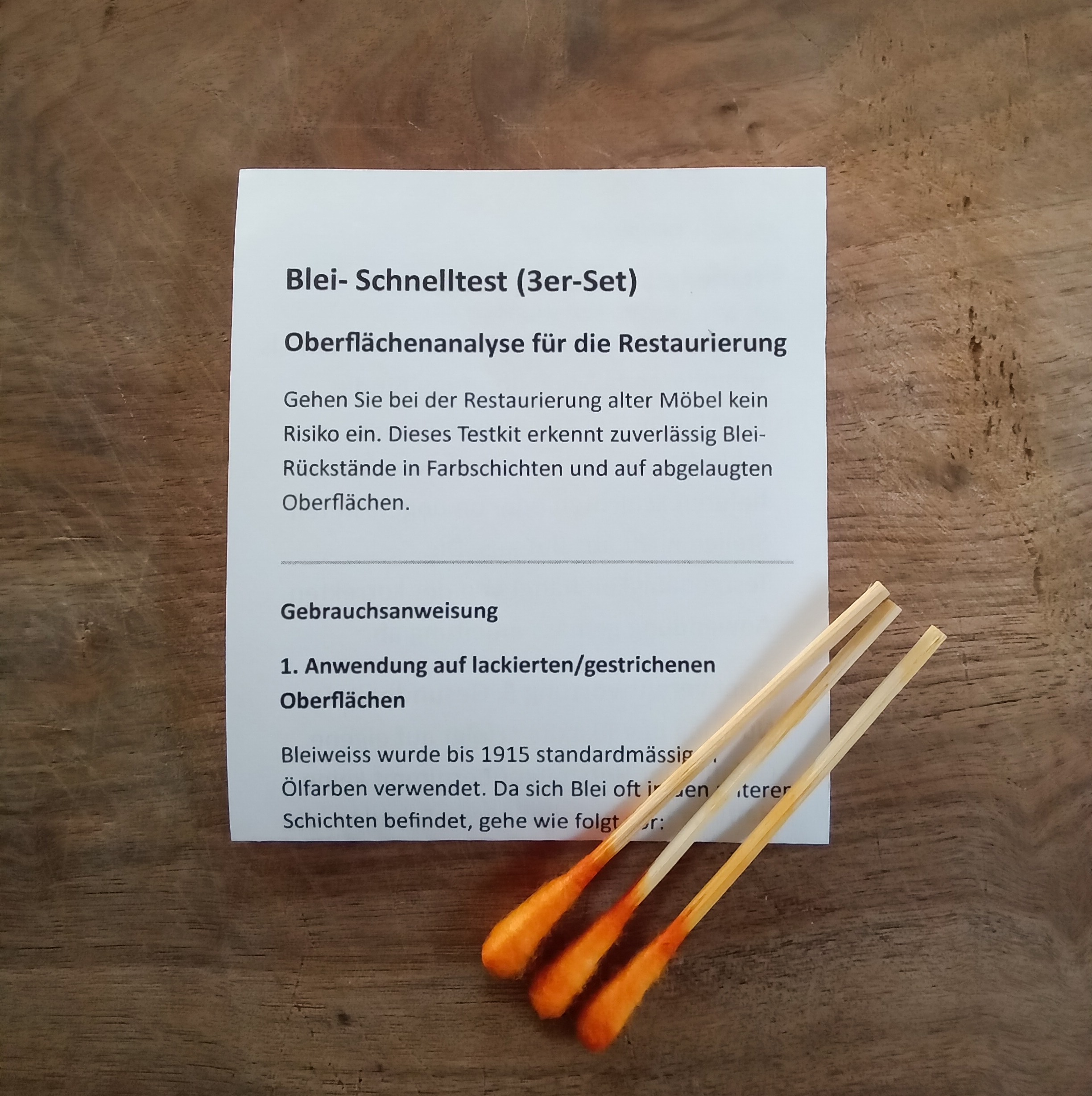 Gehen Sie bei der Restaurierung alter Möbel kein Risiko ein. Dieses Testkit erkennt zuverlässig Blei-Rückstände in Farbschichten und auf abgelaugten Oberflächen. Mit ausführlicher Anleitung.